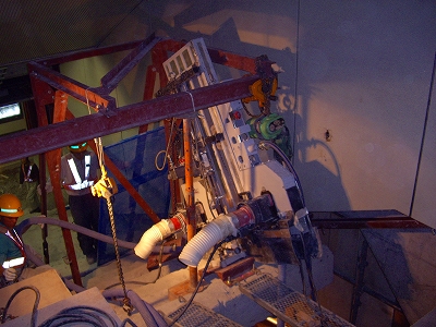 従来は、ダイヤモンドワイヤーによるコンクリート構造物の切断は、切断対象物にダイヤモンドワイヤーをリング状に巻き付け高速回転循環走行させて切断します。この時、ダイヤモンドワイヤーの冷却と切粉の排出のため清水〈せいすい〉を注入していました。
